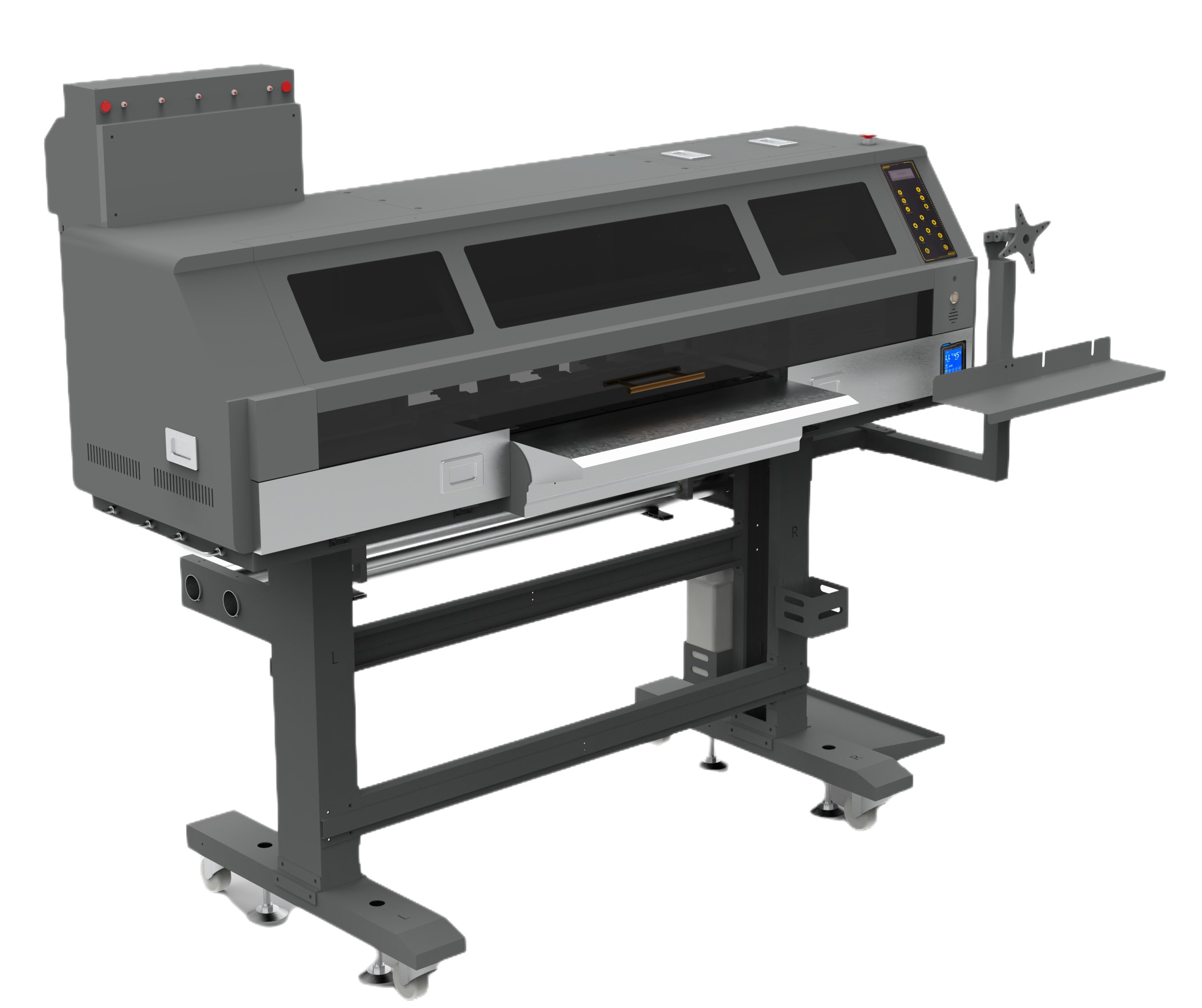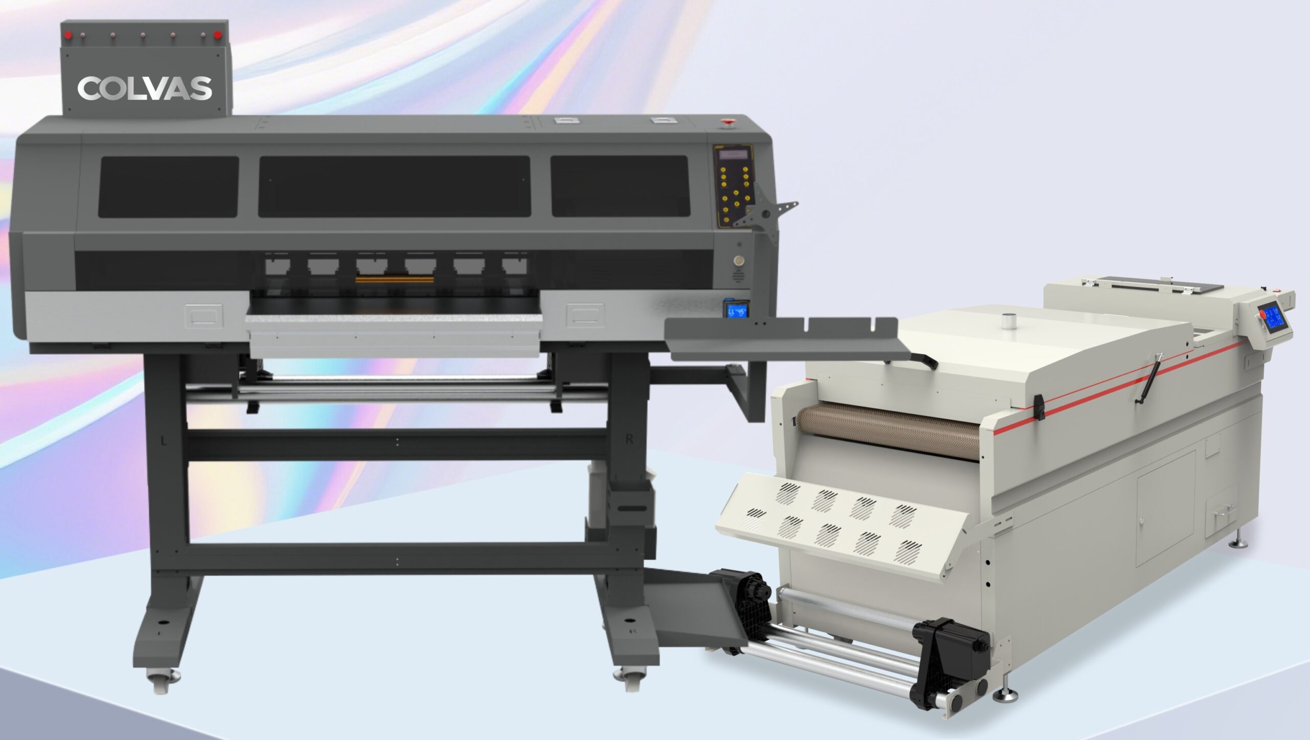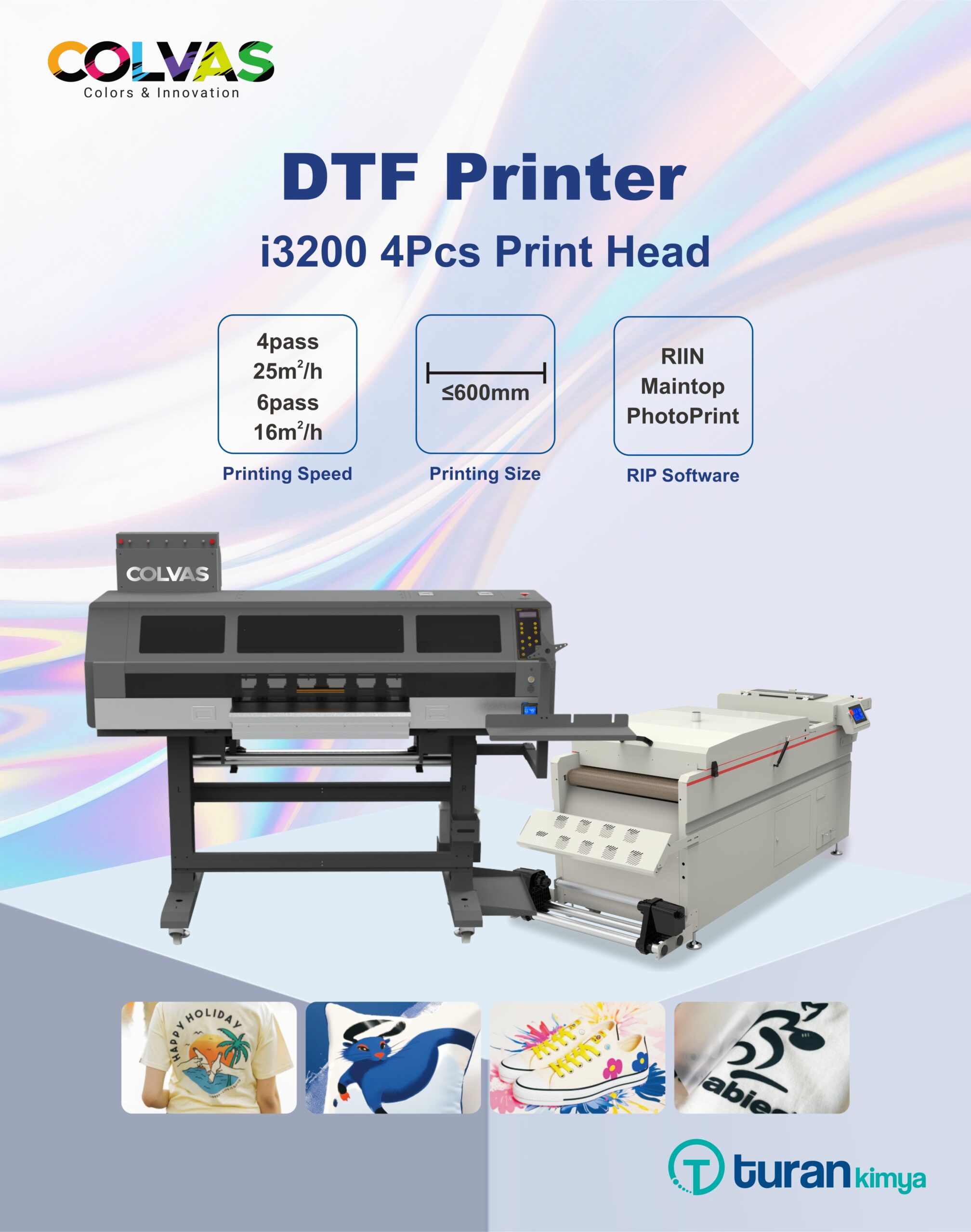PRINTING HEADS: EPSON I3200-A1 PRINTING HEAD NBR: 4 INK COLOR: CMYK+W PRINTING SIZE max: 600mm PRINTING SPEED: 4 PASS – 25 m2 / h 6 PASS – 16 m2 / h RIP SOFTWARE: FLEXIPRINT (PHOTOPRINT) PRINTING MEDIA: PET FILM