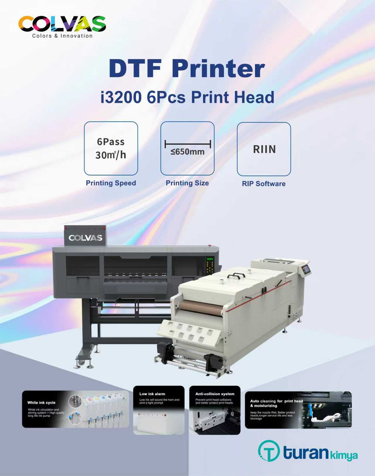 PRINTING HEADS: EPSON I3200-A1 PRINTING HEAD NBR: 6 INK COLOR: CMYK+W PRINTING SIZE max: 630mm PRINTING SPEED: 6 PASS – 30 m2 / h RIP SOFTWARE: RIIN PRINTING MEDIA: PET FILM